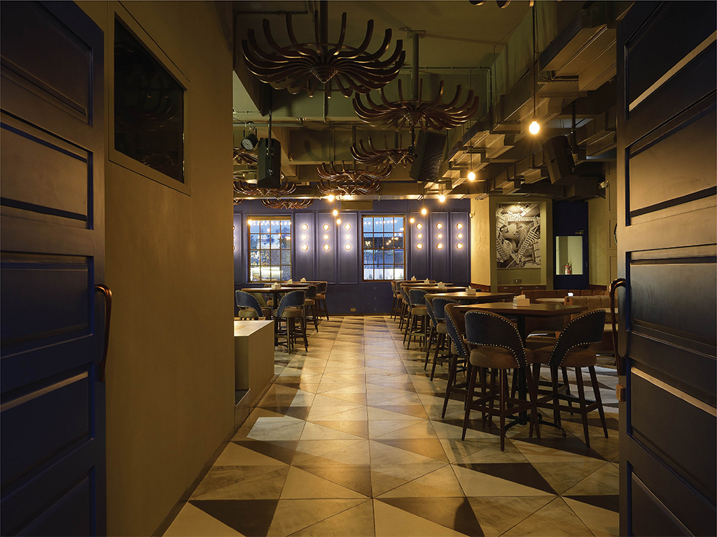 The client intended to create a space which exudes a sense of calm to its patrons. The idea was to create a beer garden which is a perfect spot for an informal evening spent in socializing with friends. The challenge was to tell a story to the guests through a dramatic space. Through the use of a balanced combination of colours, textures, illumination and overall circulation, the designers have attained an easy going vibe. The earthy tones of wood and brick and the polished granite disperse the warm lighting of the chandeliers. The quirky use of blues, posters and metallic fixtures give an interesting view from each seating. The interior seamlessly flows into the exterior open space. The soft scape of the exterior is in tune with the central hardscape of the overall design. The multi utility seating accommodates the varying footfalls over the week. By placing a stage and a dedicated bar at opposite ends of the open area makes the space visually exposed, without restricting the head movement to just one direction. Being a brewery, the location of fermentation room and storage room was critical. Placing it right at the entrance gives the guests a direct view of the area creating an intimate relation between them and the bar