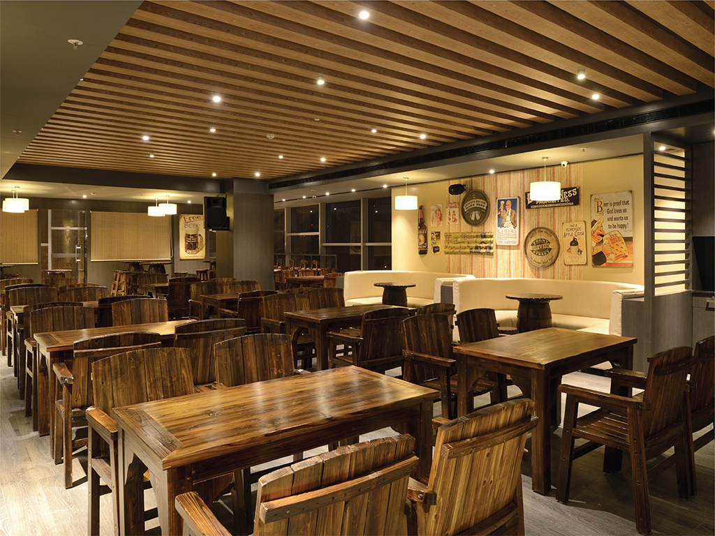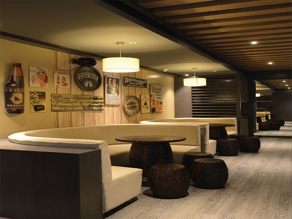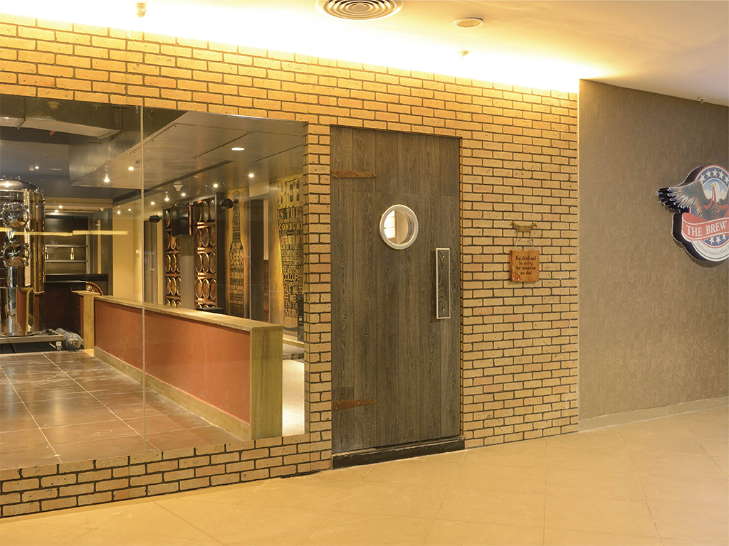 The idea was to create a brewery with the ambience of an English pub with a touch of the local feel. Materials like burnt bricks and natural wood finish that go very well with the grey of the ceiling and the light beige flooring are used to give the space an earthy tone and a rustic feel. The brewing tanks displayed out of the glass enclosure complete the look of the brewery. This feel is further enhanced with the copper domes, made out of the same brewing tanks that are displayed under the bar. The proper placement of the bar at the entrance and the strategically located brewing tanks establish a visual connect with the guests in the seating area. The unique graffiti, on the wall next to the brewing tanks, is inspired from the city’s various icons add the local touch to the entire area.