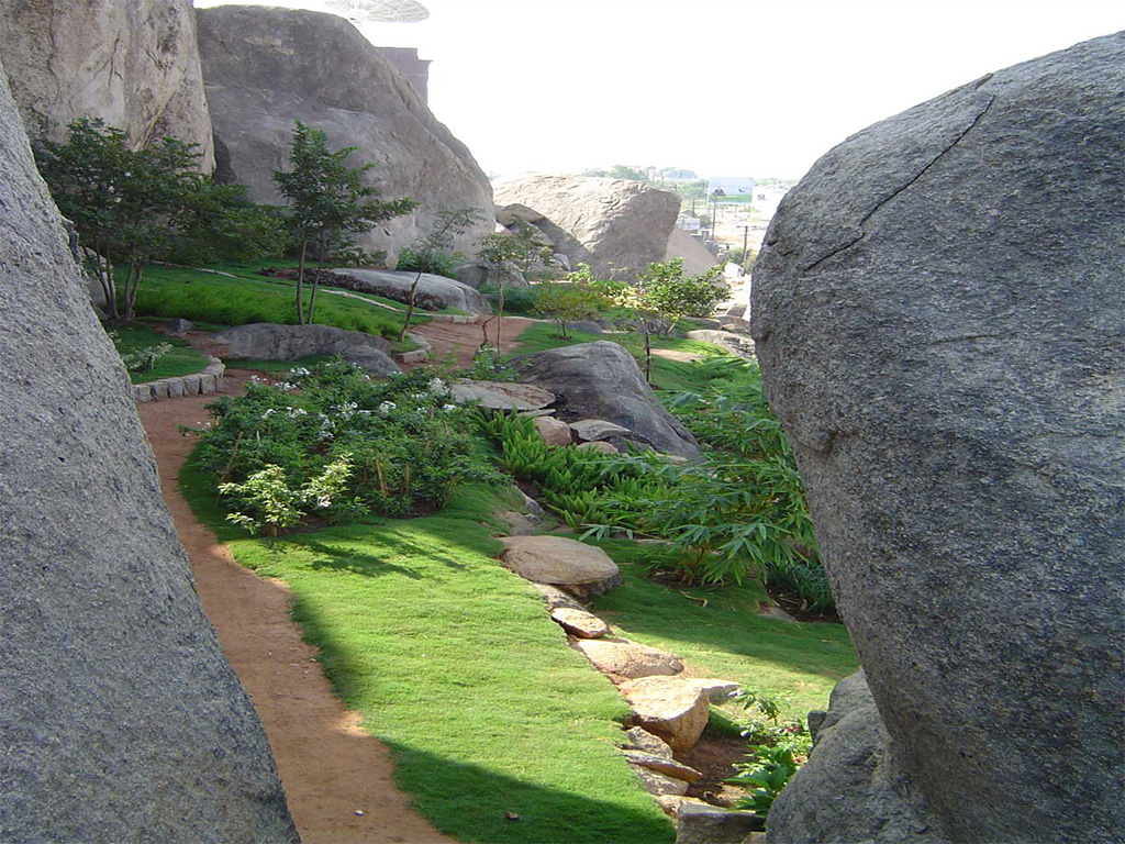 The client wished for a landscape design that would incorporate the naturally available boulders and have a minimal look. We got to work with renowned Architect Mario Botta on this project. The idea was to create such a landscape that would create a perception of the structure being set in the natural surroundings. This was done by including the natural boulders available on the site in the design. The plantation palette is restricted to green to bring out the earthy colour of the structure.
