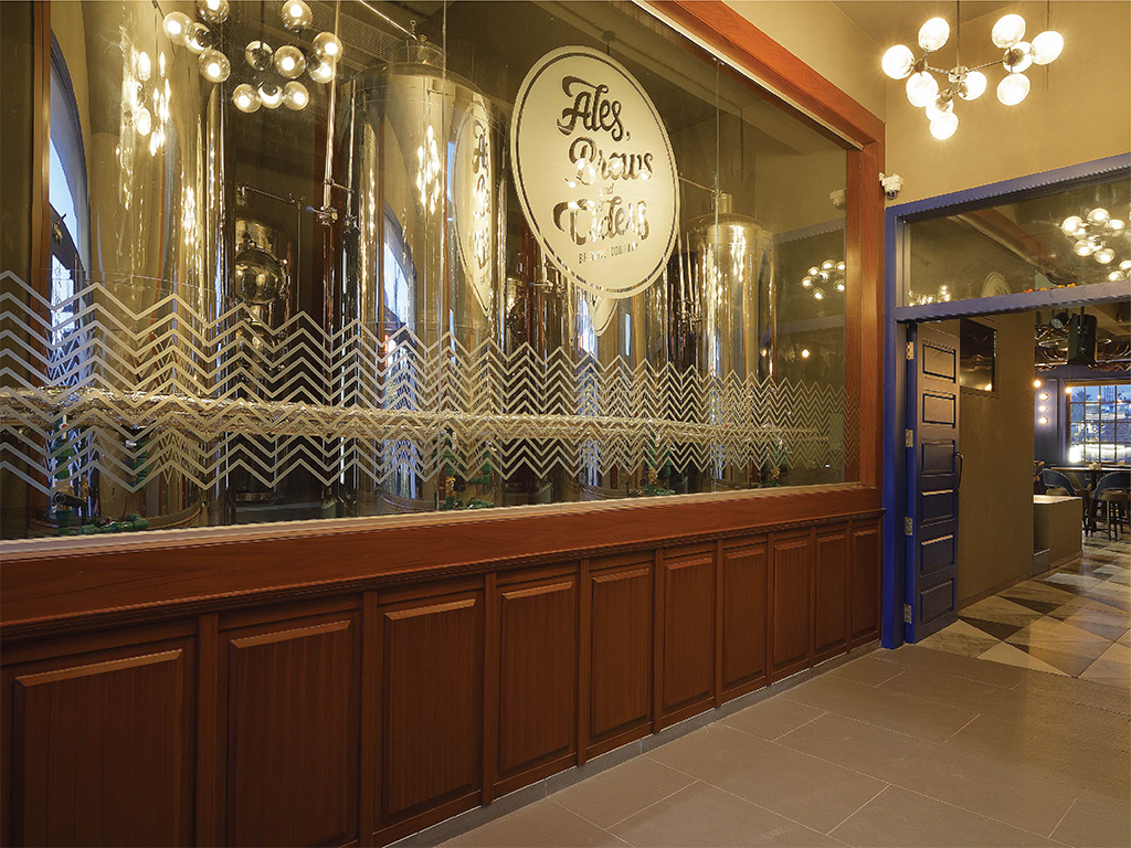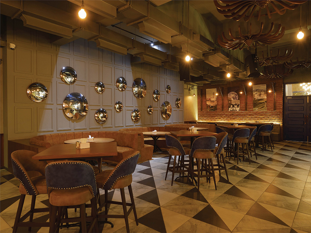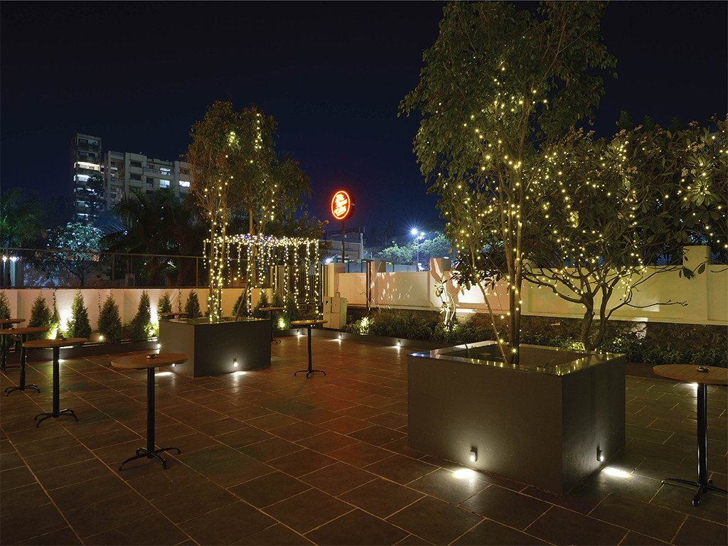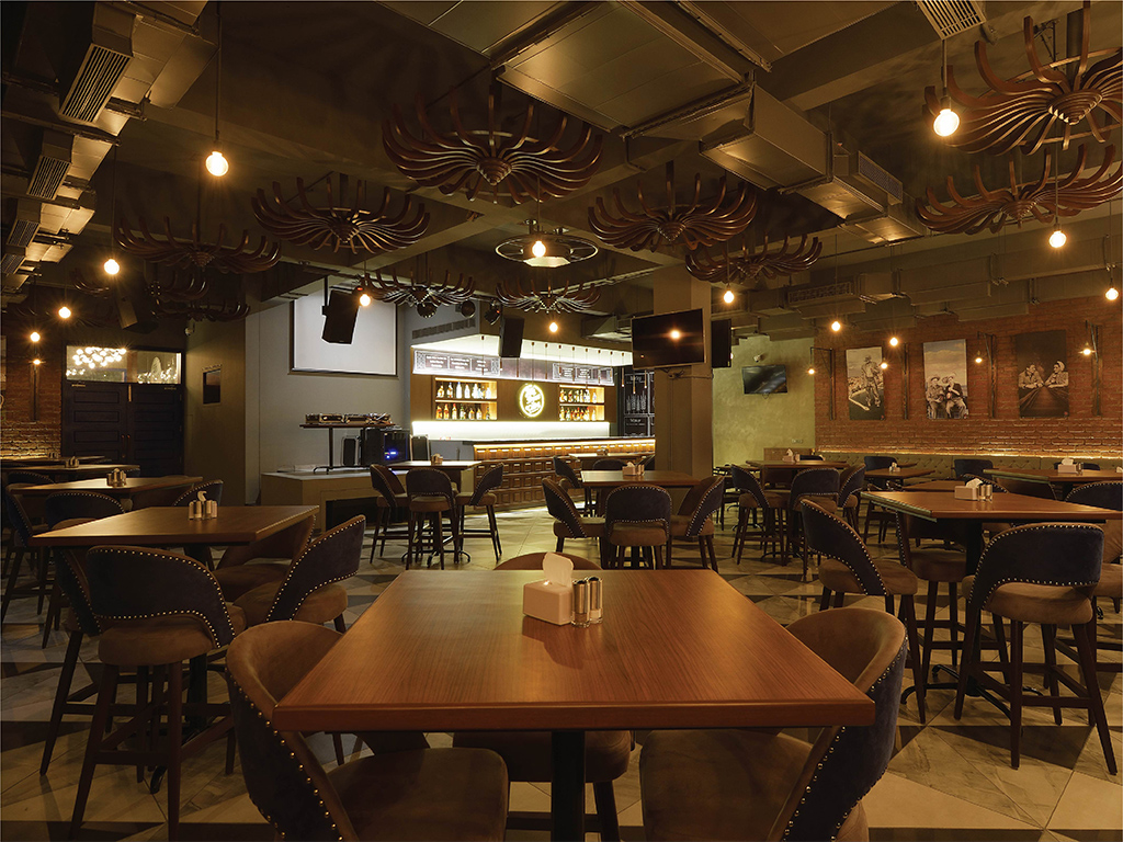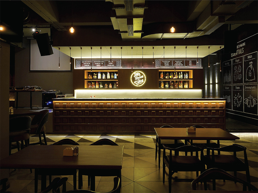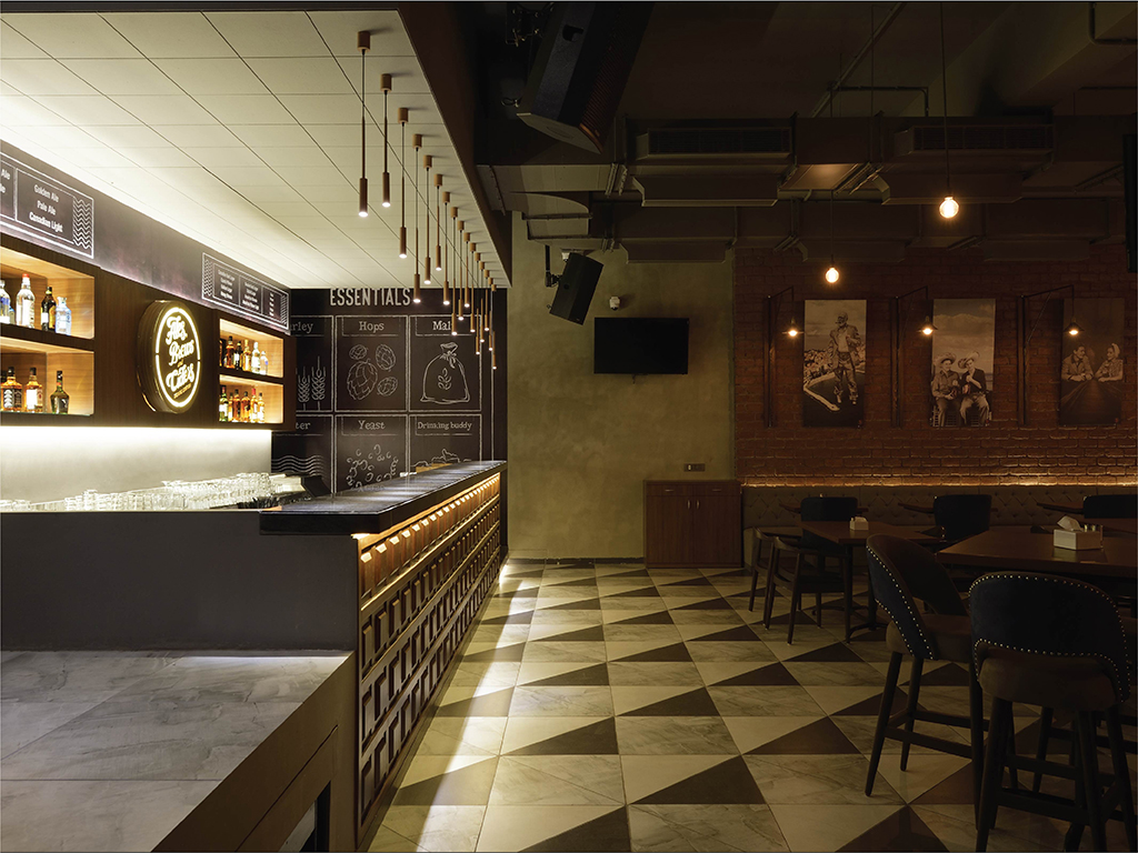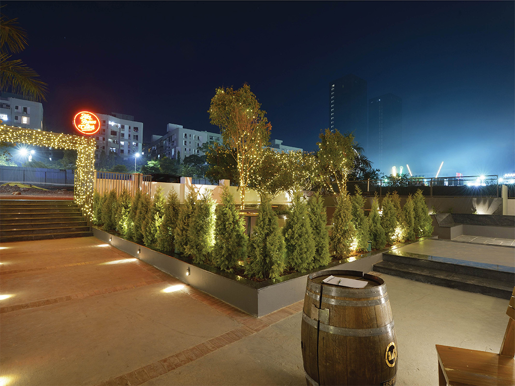The client intended to create a space which exudes a sense of calm to its patrons. The idea was to create a beer garden which is a perfect spot for an informal evening spent in socializing with friends. The challenge was to tell a story to the guests through a dramatic space. Through the use of a balanced combination of colours, textures, illumination and overall circulation, the designers have attained an easy going vibe. The earthy tones of wood and brick and the polished granite disperse the warm lighting of the chandeliers. The quirky use of blues, posters and metallic fixtures give an interesting view from each seating. The interior seamlessly flows into the exterior open space. The soft scape of the exterior is in tune with the central hardscape of the overall design. The multi utility seating accommodates the varying footfalls over the week. By placing a stage and a dedicated bar at opposite ends of the open area makes the space visually exposed, without restricting the head movement to just one direction. Being a brewery, the location of fermentation room and storage room was critical. Placing it right at the entrance gives the guests a direct view of the area creating an intimate relation between them and the bar