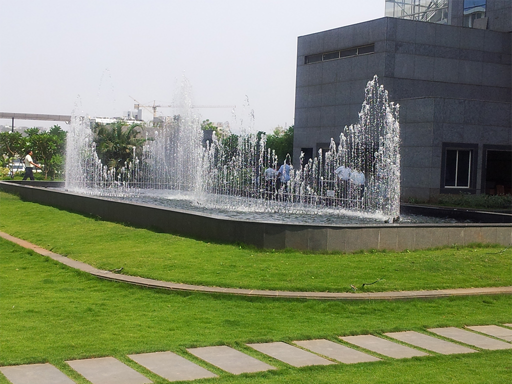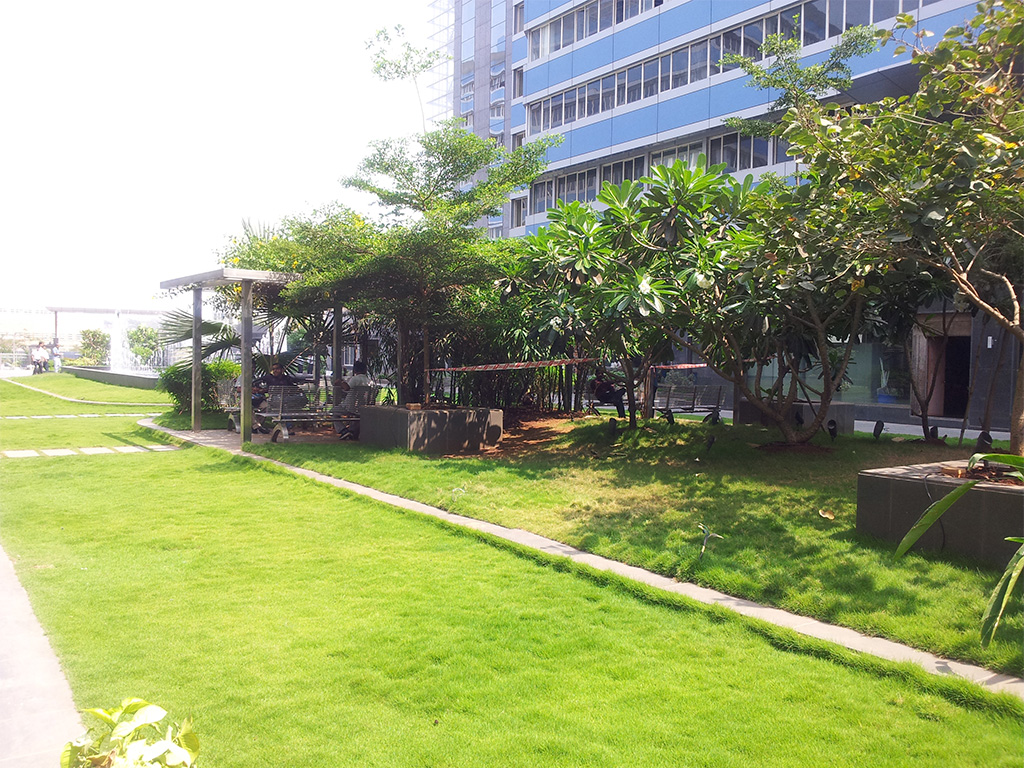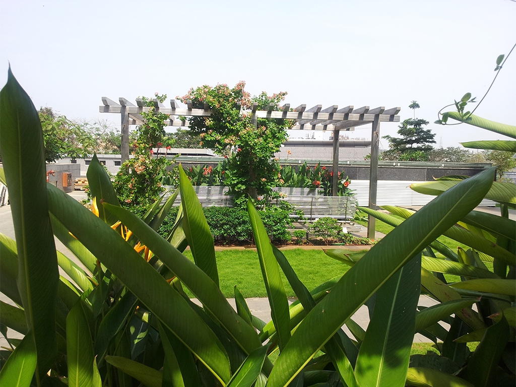 The client came to us for landscaping for a project that was built 8 years. The project posed multiple challenges. Due to the passage of time, the previous architects or structural engineers could not be contacted regarding the structural details. We started by studying the site and designing accordingly. There were no sunken areas that could be used for plantation. We also had to keep the design light so as to avoid damages to the structure. We did this by using the existing slab innovatively. The lawn was laid down in 6 to 8 inches deep sections. Stainless steel and glass are carefully used for the head office of Diamond Bourse. Pergolas, benches for seating and lighting features complete the overall landscape.