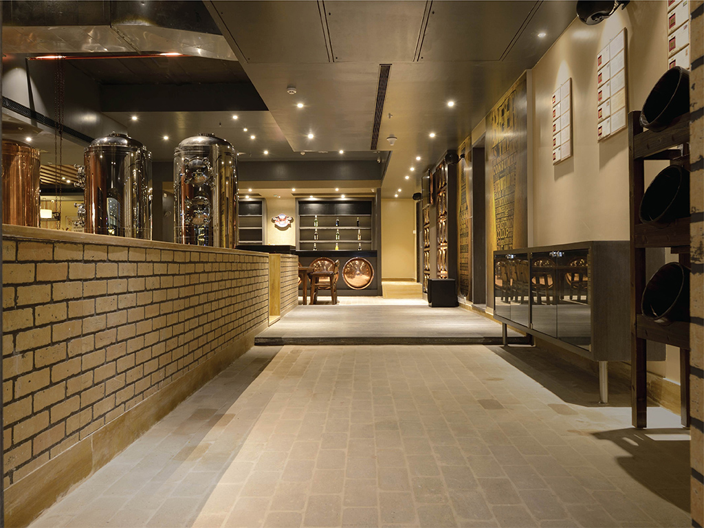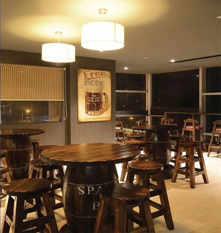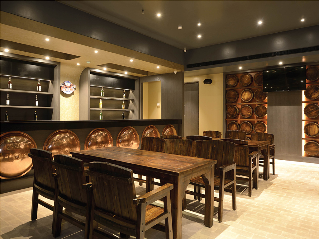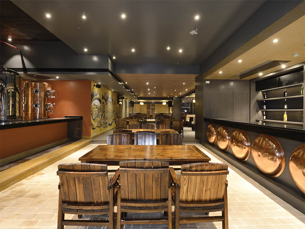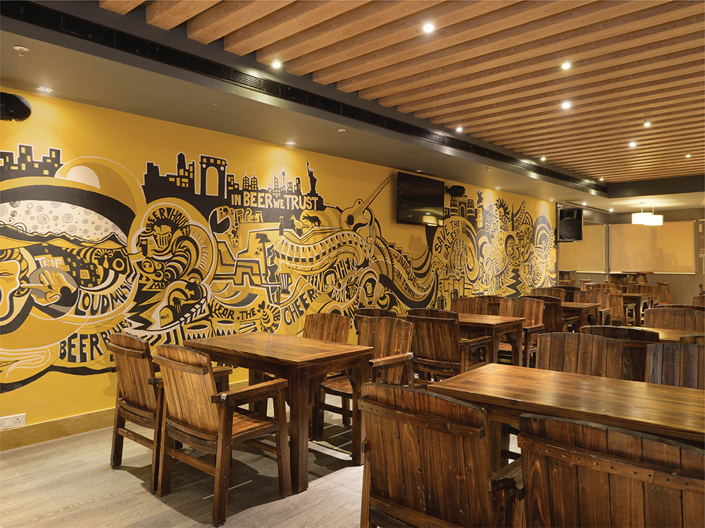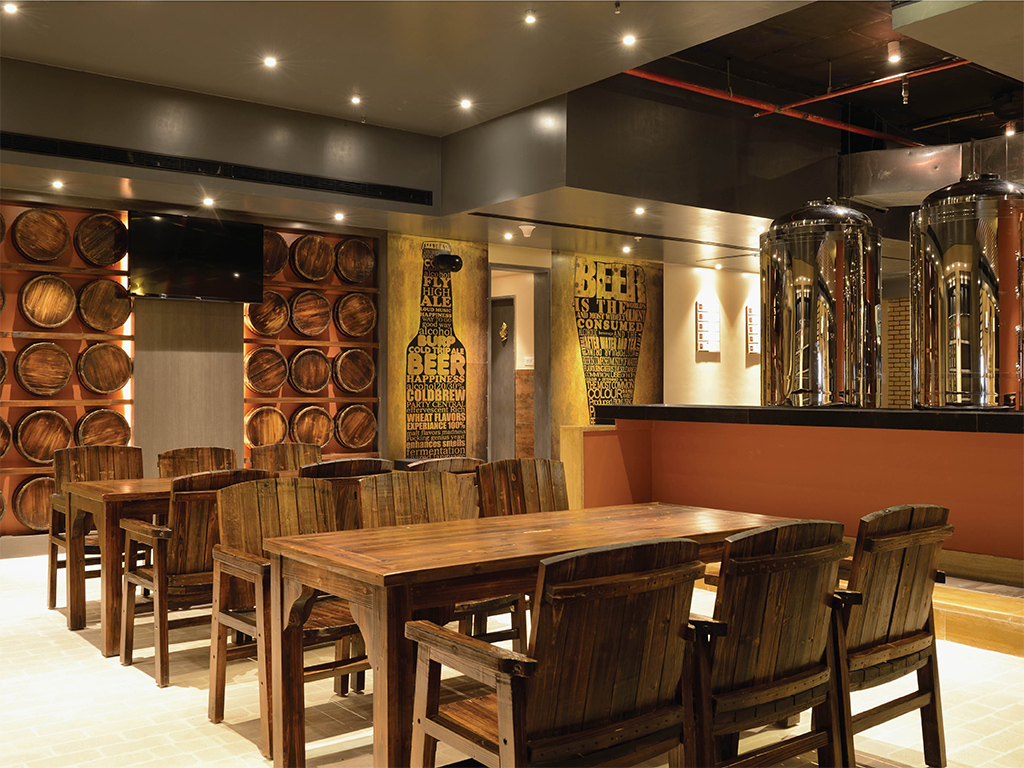 The idea was to create a brewery with the ambience of an English pub with a touch of the local feel. Materials like burnt bricks and natural wood finish that go very well with the grey of the ceiling and the light beige flooring are used to give the space an earthy tone and a rustic feel. The brewing tanks displayed out of the glass enclosure complete the look of the brewery. This feel is further enhanced with the copper domes, made out of the same brewing tanks that are displayed under the bar. The proper placement of the bar at the entrance and the strategically located brewing tanks establish a visual connect with the guests in the seating area. The unique graffiti, on the wall next to the brewing tanks, is inspired from the city’s various icons add the local touch to the entire area.