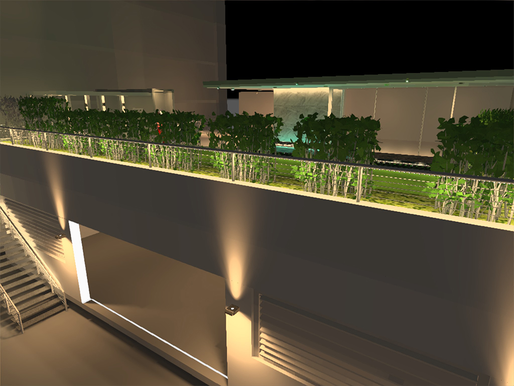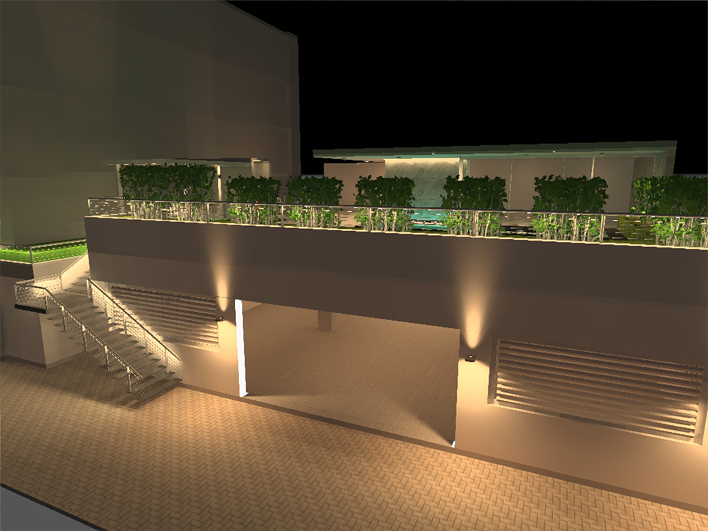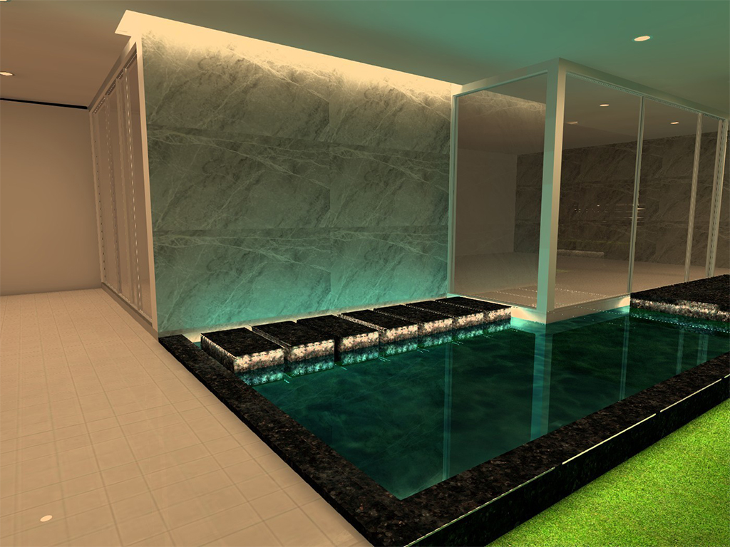 The client wanted to enhance the clean lines, sumptuous materials and the overall landscape of the project. For this project we incorporated a versatile lighting scheme created by using a leaner LED cove wall light, floor lamps and downlights to fashion an elegant and sophisticated private home lounge. The illuminations are integrated into the architecture. The hand rail has the concealed flood lights with minimum footprint to consolidate with the design. There is a led trip below the seating, corner LED strip and LED spots are placed under the stepping-stone for water illumination. The tuneable concealed downlight with R.F. control controls the colour of the LED from Warm White (2700K) To Cool White (6500K) which enhances the overall landscape design.