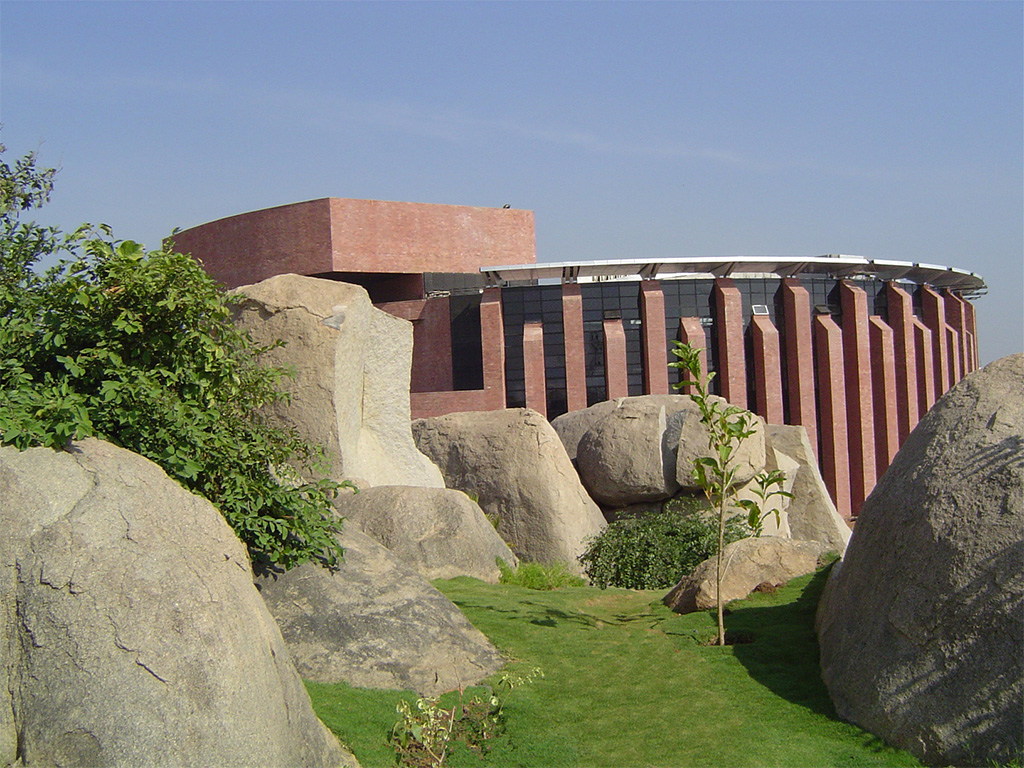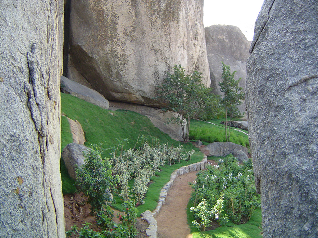 The client wished for a landscape design that would incorporate the naturally available boulders and have a minimal look. We got to work with renowned Architect Mario Botta on this project. The idea was to create such a landscape that would create a perception of the structure being set in the natural surroundings. This was done by including the natural boulders available on the site in the design. The plantation palette is restricted to green to bring out the earthy colour of the structure.